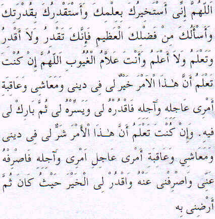 “Sizden biriniz bir iş yapmayı tasarladığı zaman, farzdan başka iki rekat namaz kılsın, sonra şöyle desin: ‘Allah’ım! Ben, senin ilmin gereğince senden hayır istiyorum ve senin kudretinle senden kuvvet istiyorum. Senin büyük fazlından diliyorum: çünkü senin gücün her şey’e yeter, benim gücüm yetmez. Sen her şeyi bilirsin, ben bilmem ve sen bütün gaybları kemal üzere bilensin. Allah’ım !Eğer bu ( düşündüğüm….) iş, dinim hakkında, yaşayışım ve işimin akıbeti hakkında hayırlıysa, onu bana kolaylaştır, sonra bu işte bana bereket ver. Yok eğer bu iş benim dinim için, yaşayışım için, işimin akıbeti için kötüyse, onu benden çevir, beni de ondan çevir. Hayır nerde ise onu bana takdir buyur, sonra beni ona razı kıl’ ” (Allahümme inni estehirüke bi-ilmike ve estakdirüke bi-kudretike ve eselüke min fadlikelazim fe inneke takdirü ve la akdirü ve tâlemü vela âlemü ve ente allamül-guyub) İstihare Duası Tam Metni Allah’ım! ezeli ilminle halimi biliyorsun, ilmine göre hayrını diliyorum, kudretinden güç istiyorum, senin büyük fazlını diliyorum. Zira sen kaadirsin, ben kaadir değilim, sen bilirsin ben bilemem, sen gizlileri bilen ve yaratansın. İstihare namazı; Kuran- Kerimde geçen Yusuf (a.s) gördüğü rüya gibi hak ve gerçek rüyalar müstesna. |